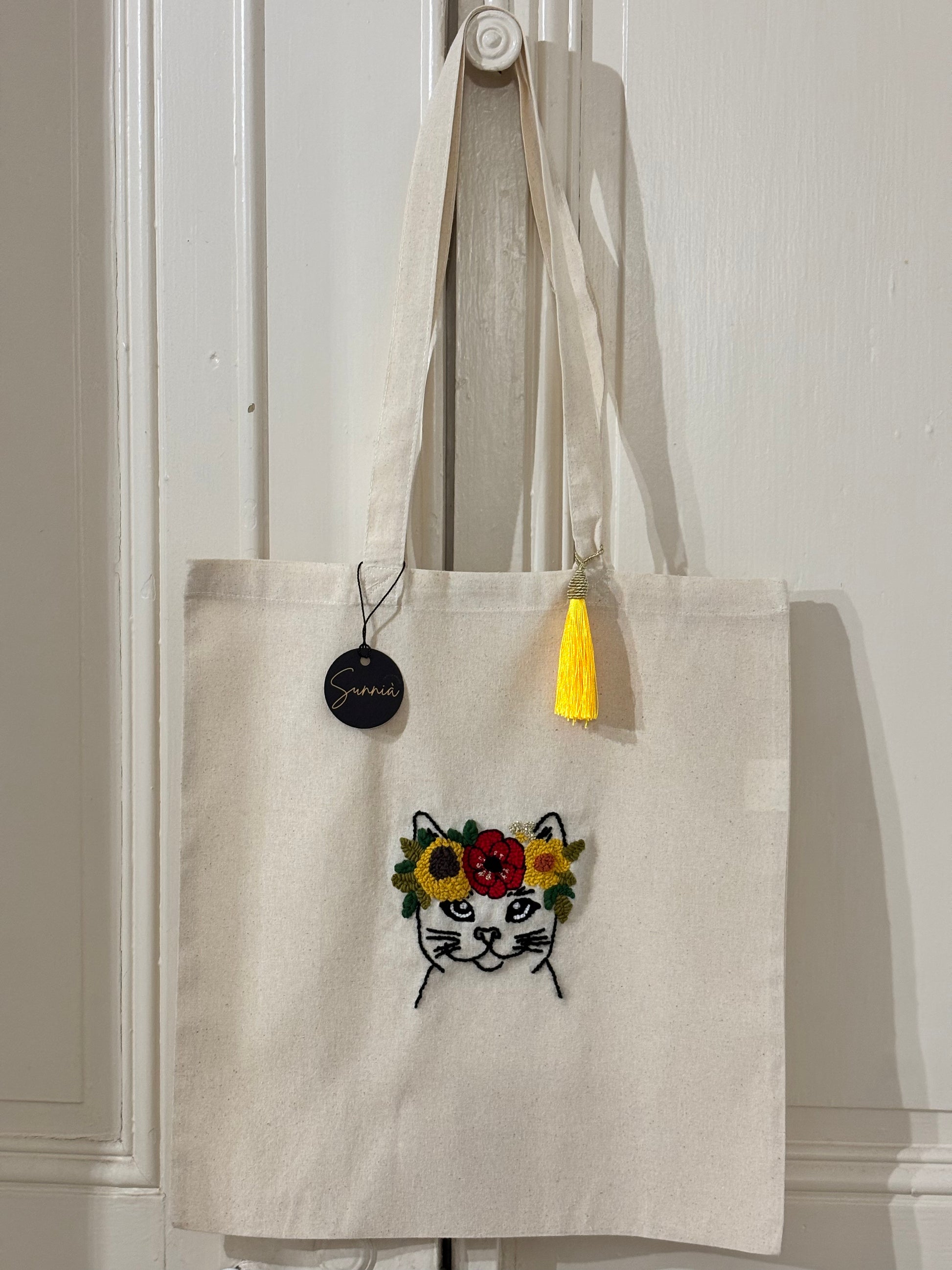 Un tote bag délicat brodé à la main en punch needle, représentant un chat doux orné d’une couronne florale colorée.