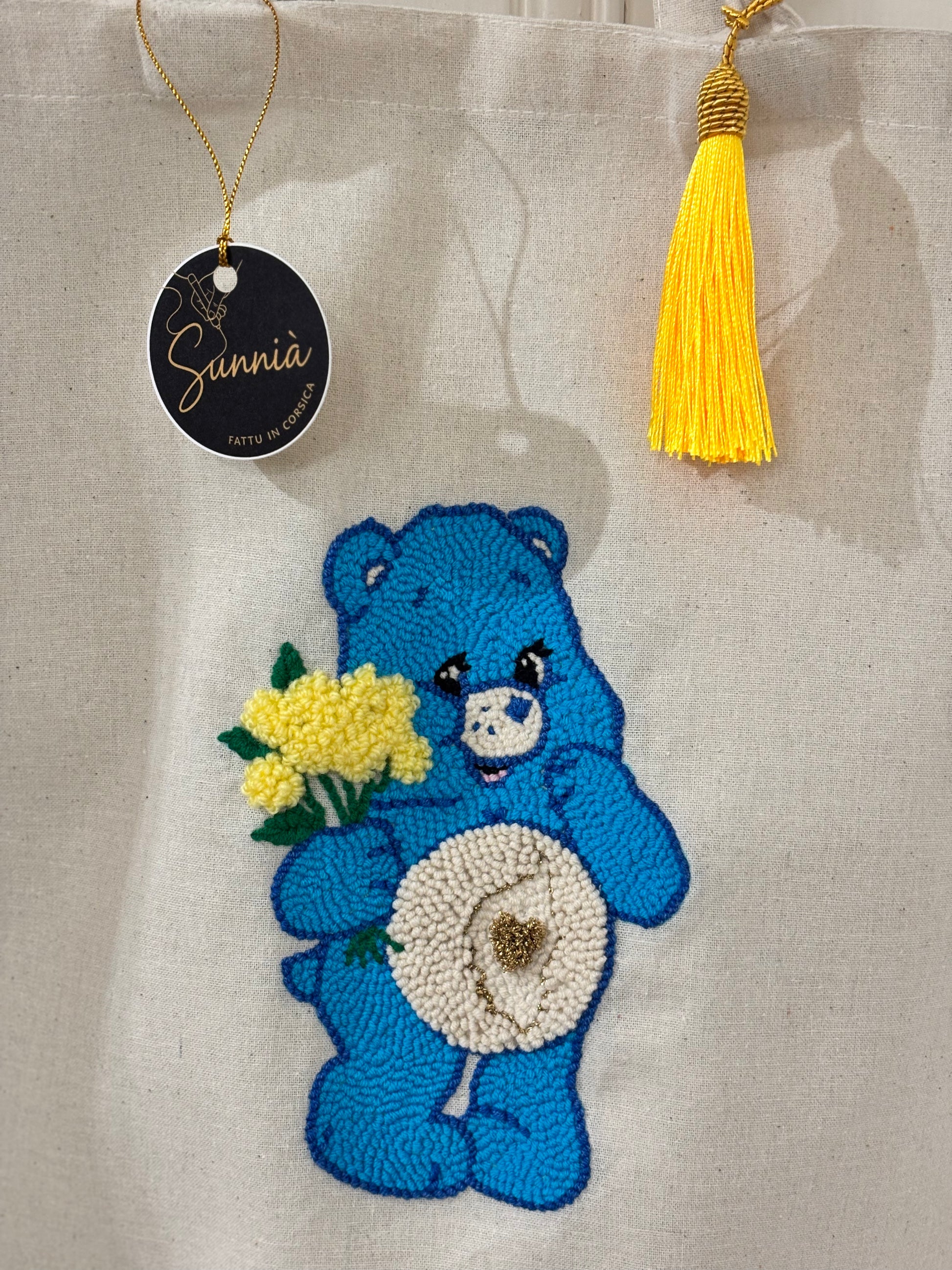 The bag is carefully selected for its quality, then personalized by hand using the punch needle technique. Each design is imagined and created with a creative spirit, inspired by Corsican culture, retro style, or the Mediterranean world.