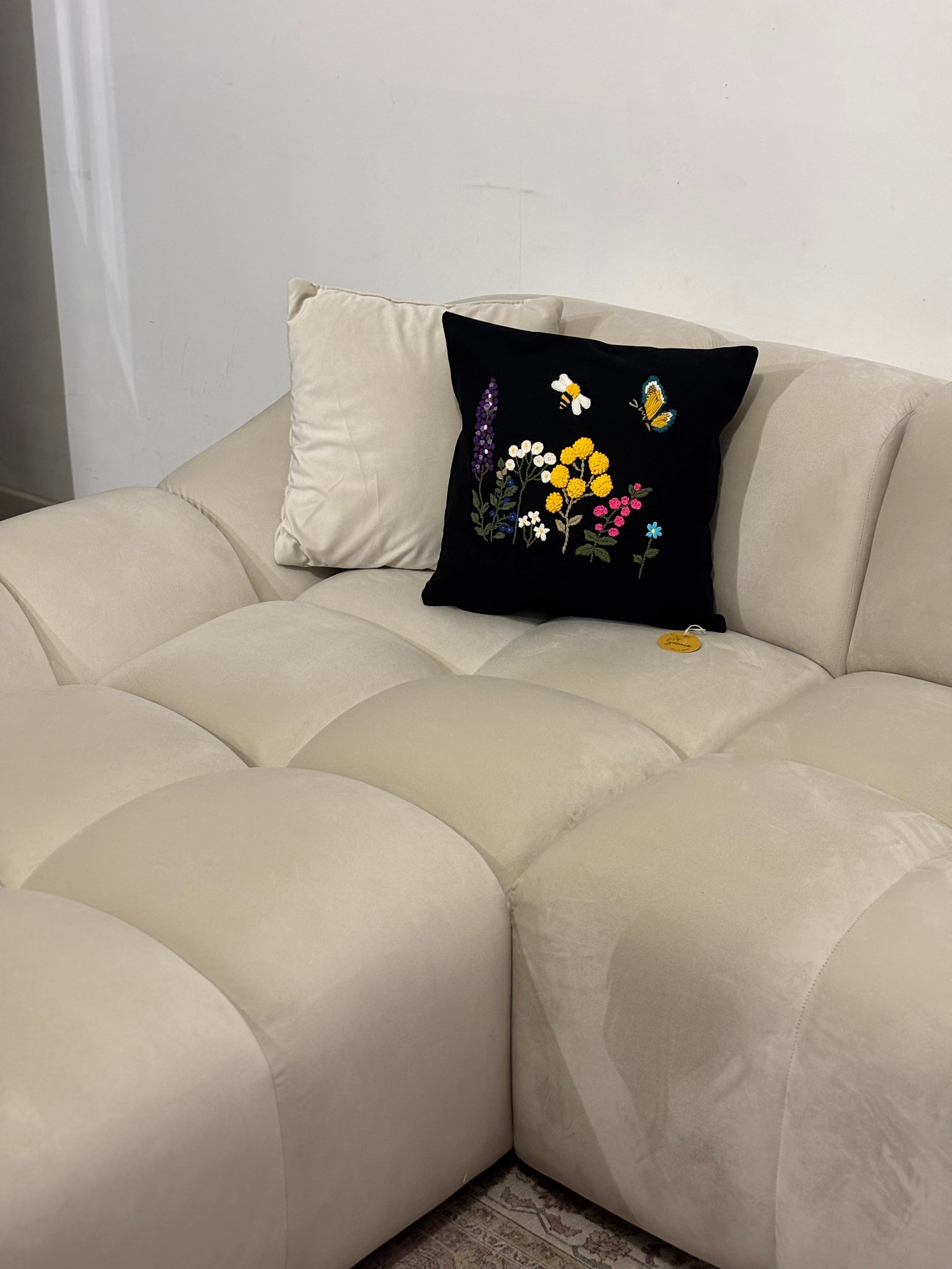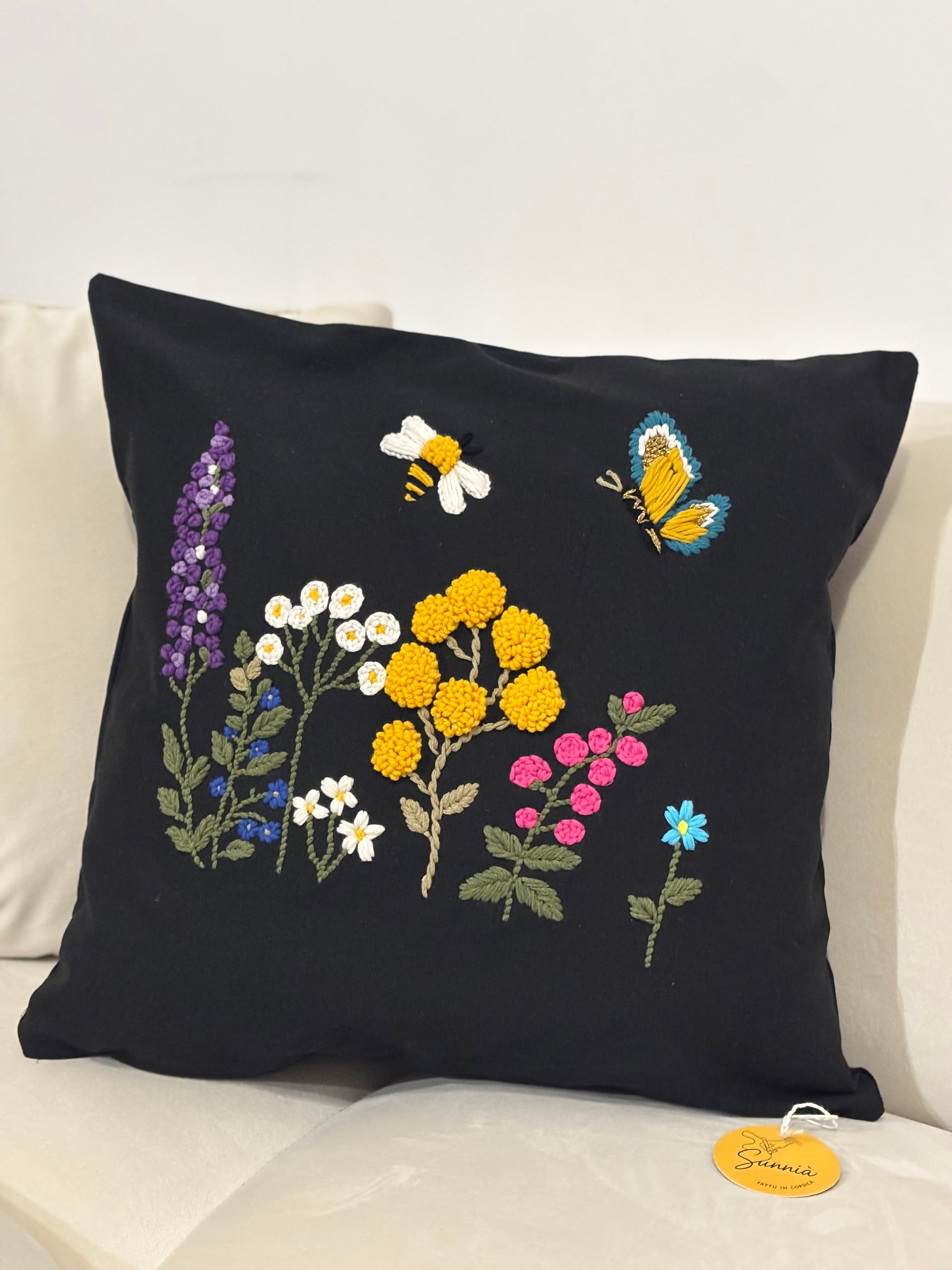 Invitez la poésie du maquis corse dans votre intérieur avec ce coussin brodé à la main.