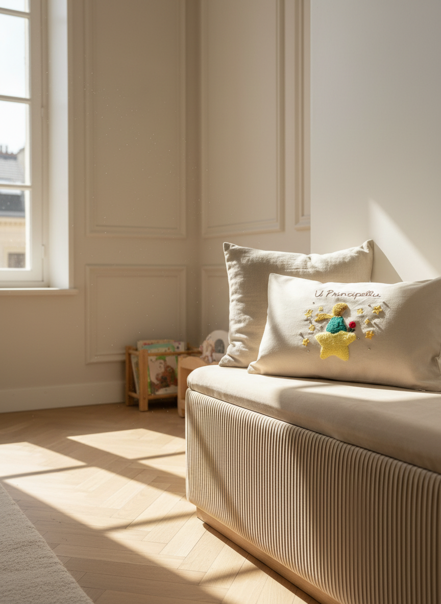 Le Petit Prince assis sur sa grande stella jaune apporte une touche poétique, tendre et lumineuse à une chambre d’enfant ou un coin lecture.