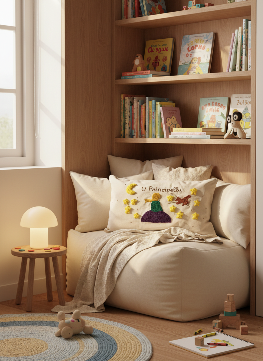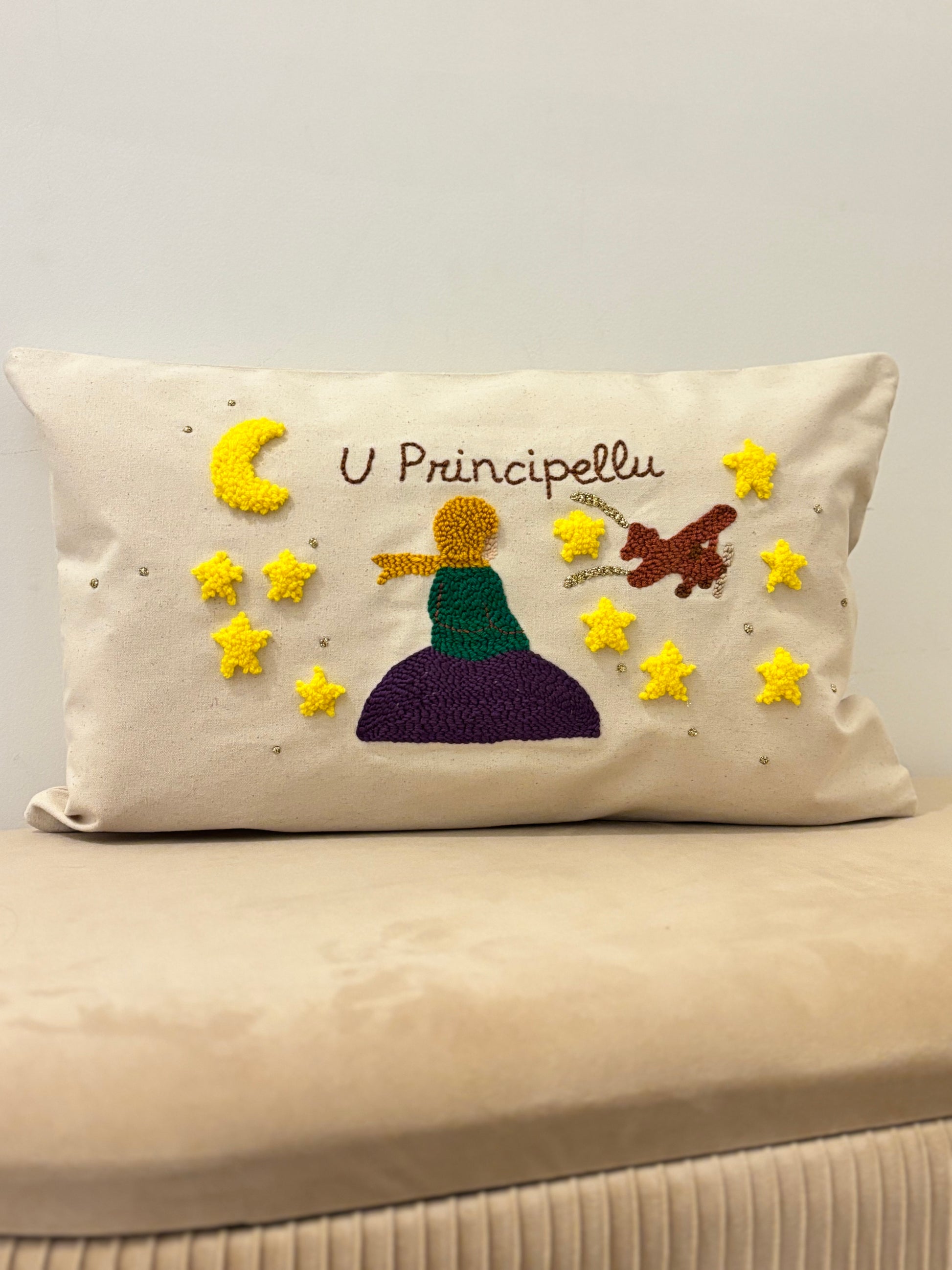 Un coussin poétique réalisé entièrement en punch needle, inspiré du célèbre univers du Petit Prince.