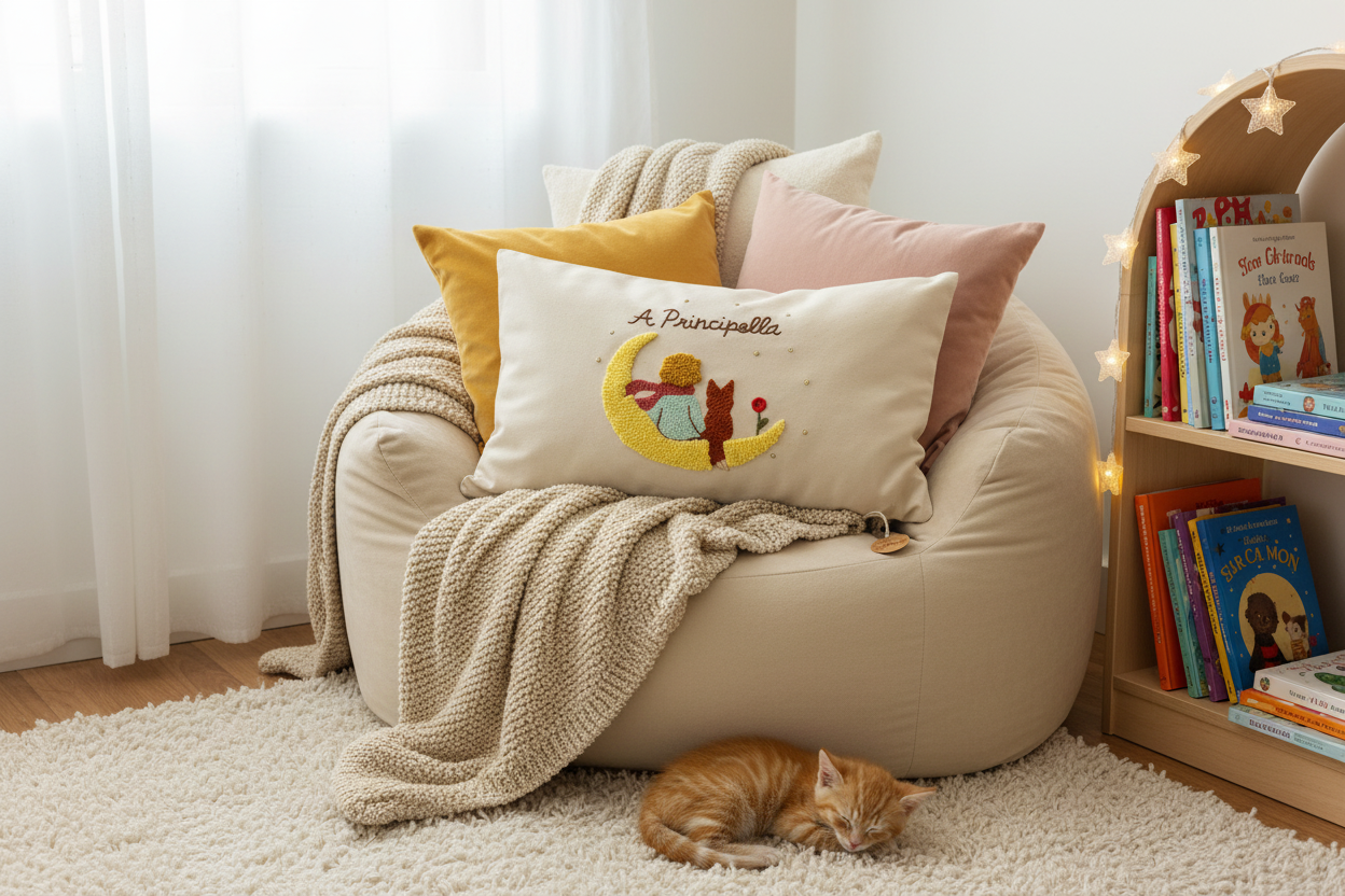 Un coussin chaleureux, texturé, au relief généreux, pensé comme une pièce décorative pleine de sens, qui trouve naturellement sa place dans une chambre, un salon ou un coin lecture.