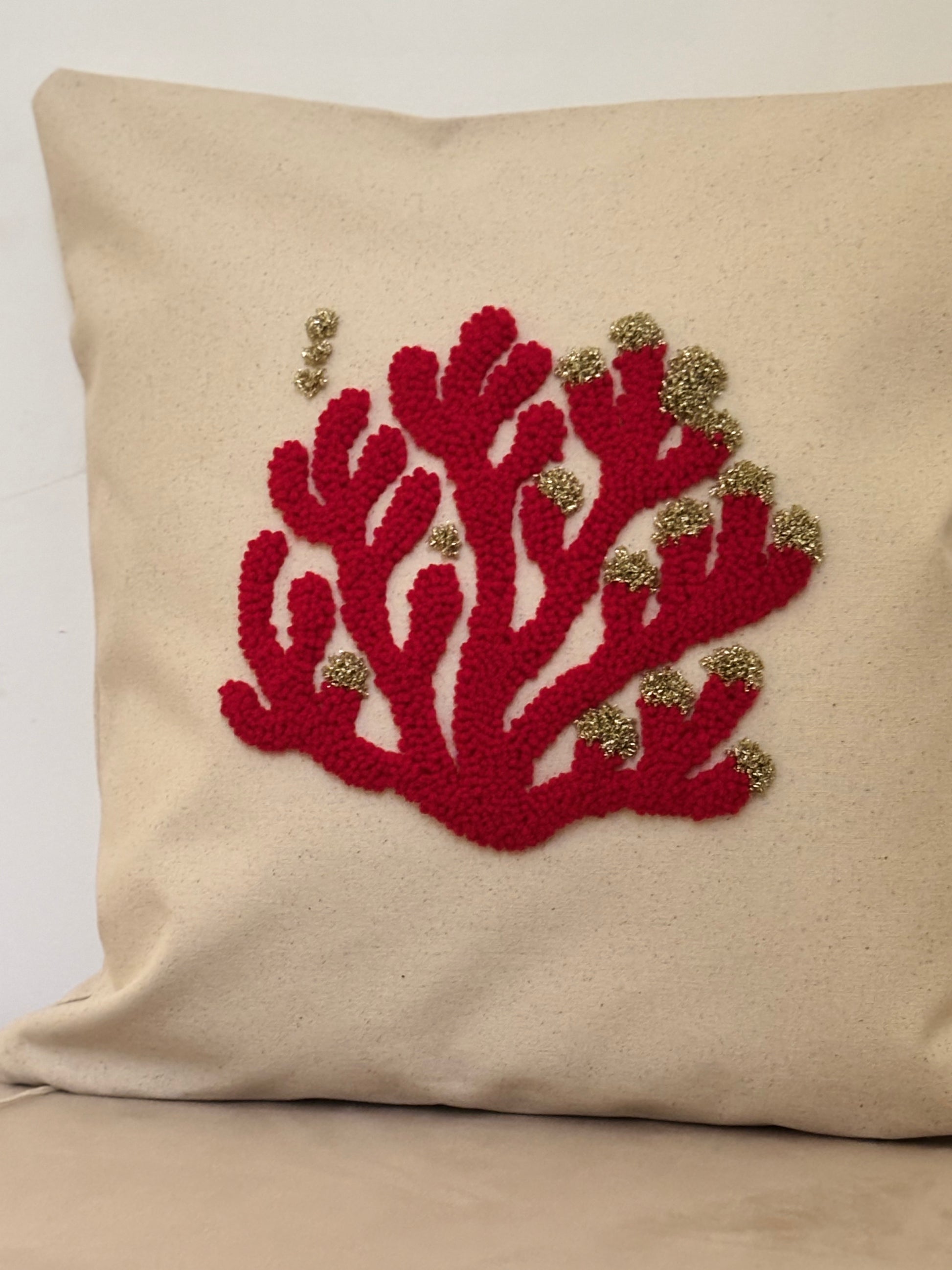 Coussin “Marina d’Oru” – Corail rouge & touches d’or (40×40)