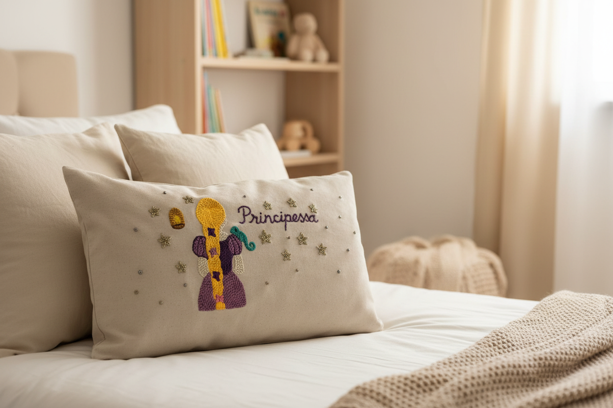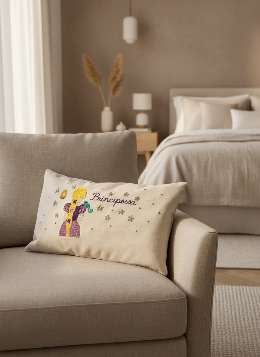 Ce coussin décoratif met en scène une princesse à la longue tresse dorée, réalisée en punch needle, avec des couleurs douces et chaleureuses : violet profond, jaune lumineux, touches de vert et de rose. Les étoiles scintillantes apportent une note féerique et élégante, idéale pour créer une atmosphère rassurante et rêveuse.