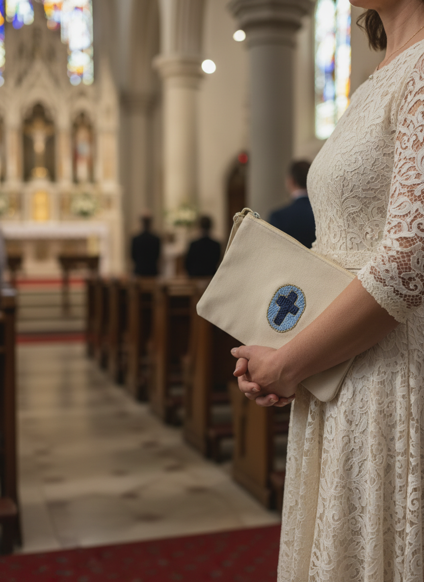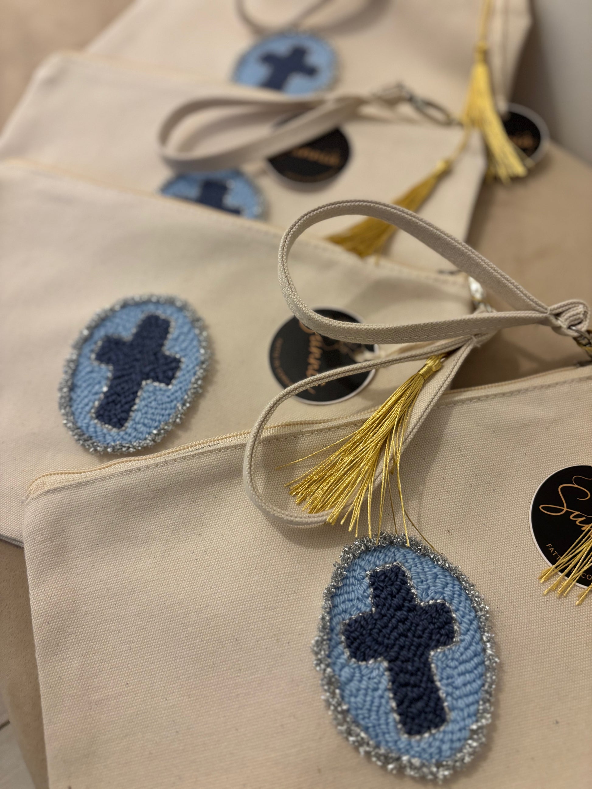 Chaque pochette est brodée à la main en punch needle, dans l’esprit des anciens médaillons protecteurs.