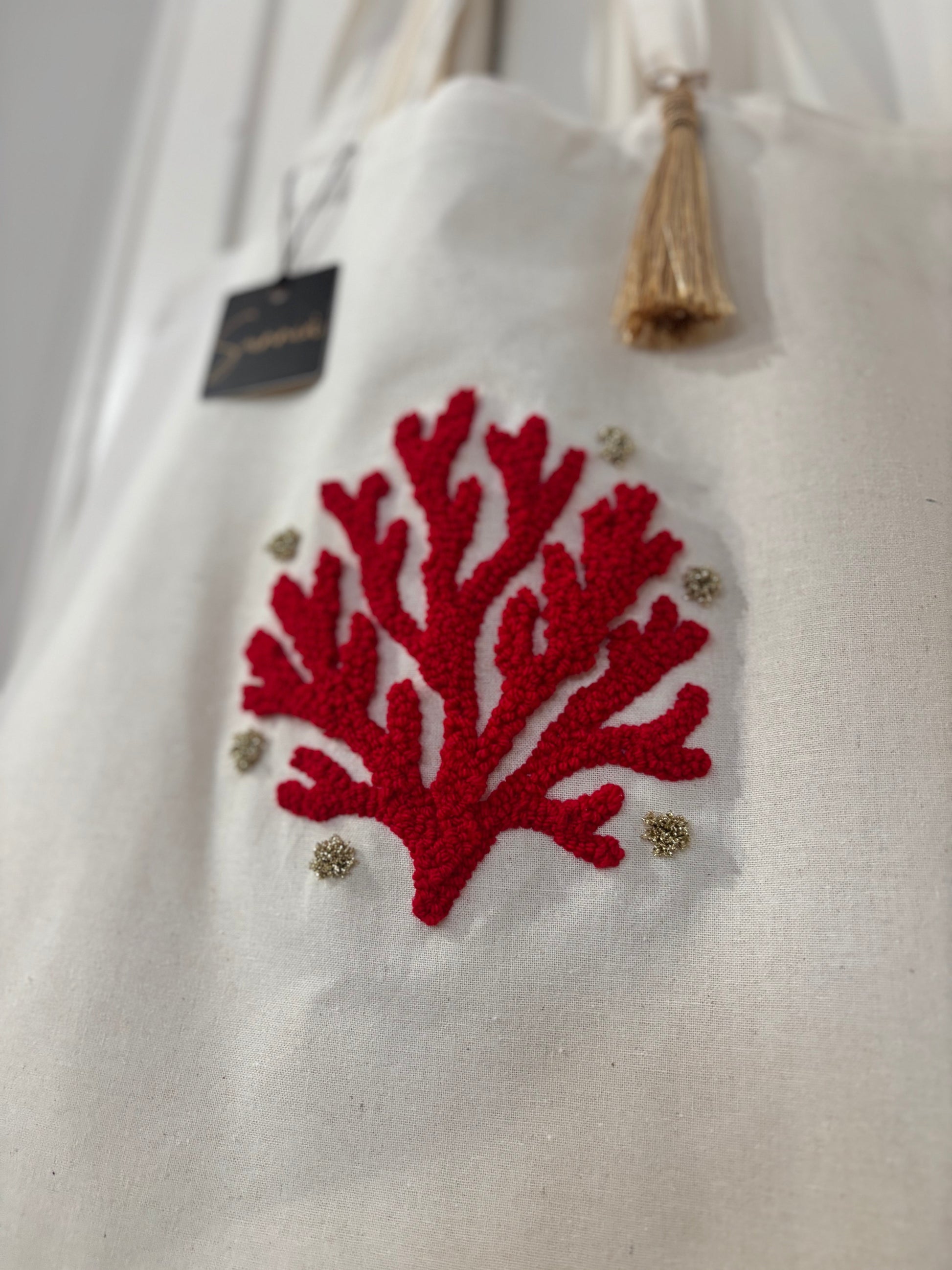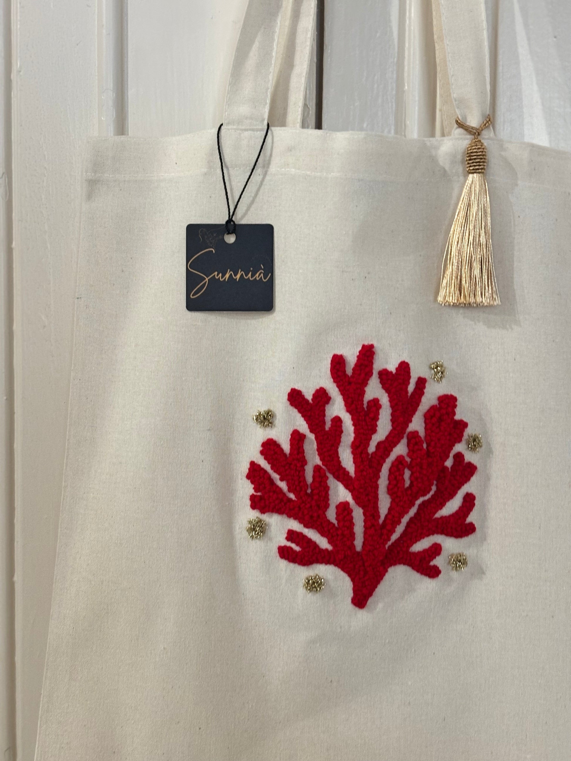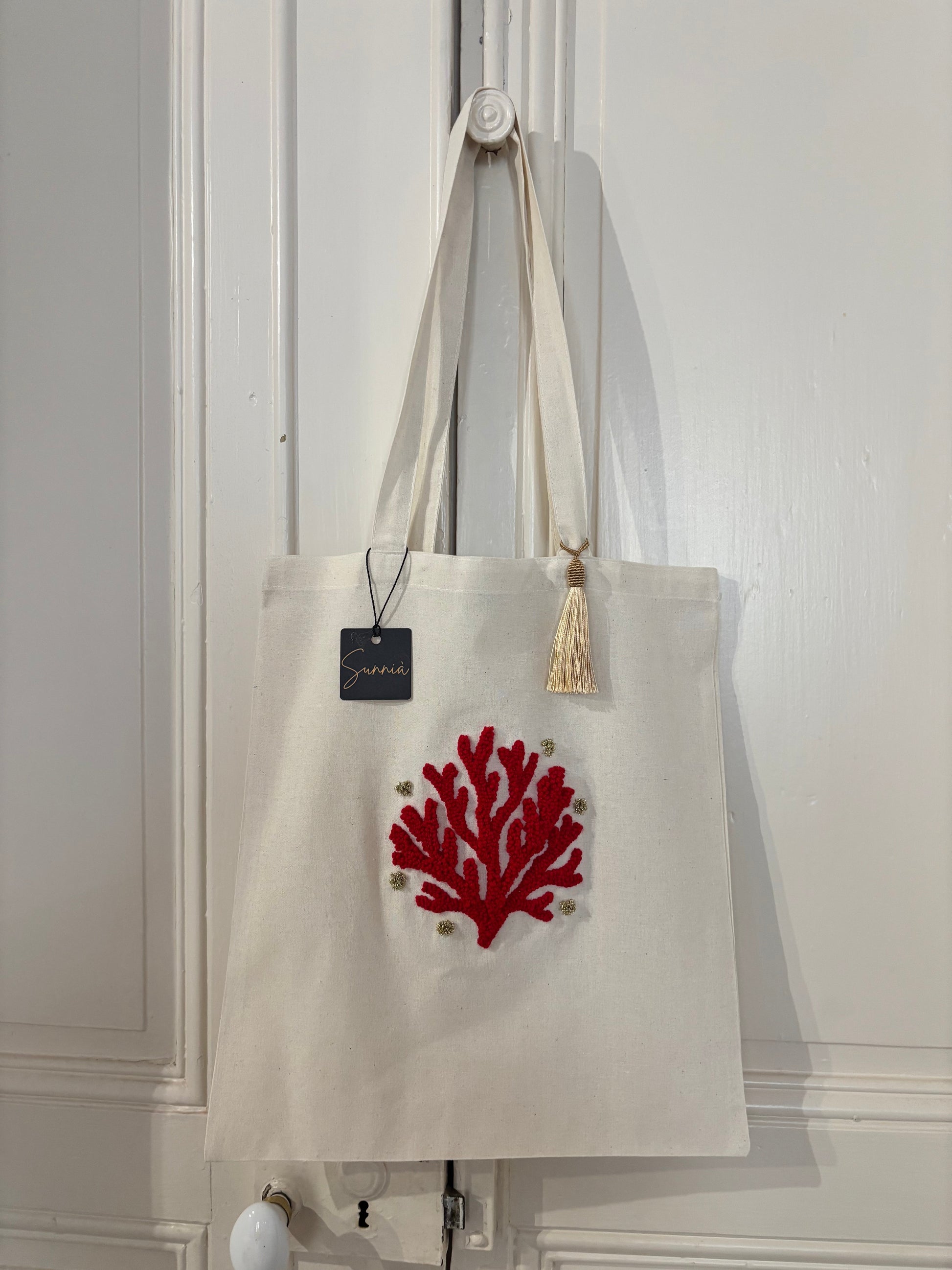 Un sac élégant, lumineux et authentique, brodé à la main avec soin. Le motif de corail rouge, vibrant et raffiné, est inspiré des fonds marins corses et ponctué de petites touches dorées étincelantes.