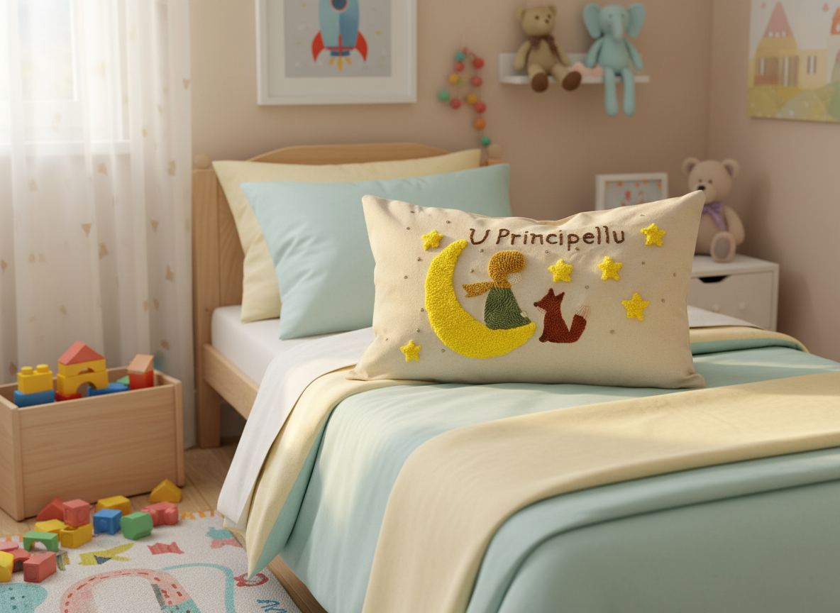 Un coussin poétique, mixte, idéal pour les chambres d’enfants, les cadeaux de naissance ou pour apporter une touche de magie à votre intérieur.