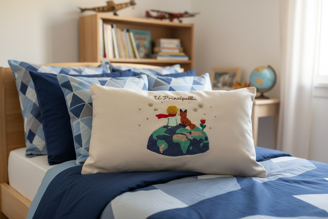 U Principellu nant’à a so pianeta est un coussin brodé entièrement à la main en punch needle.