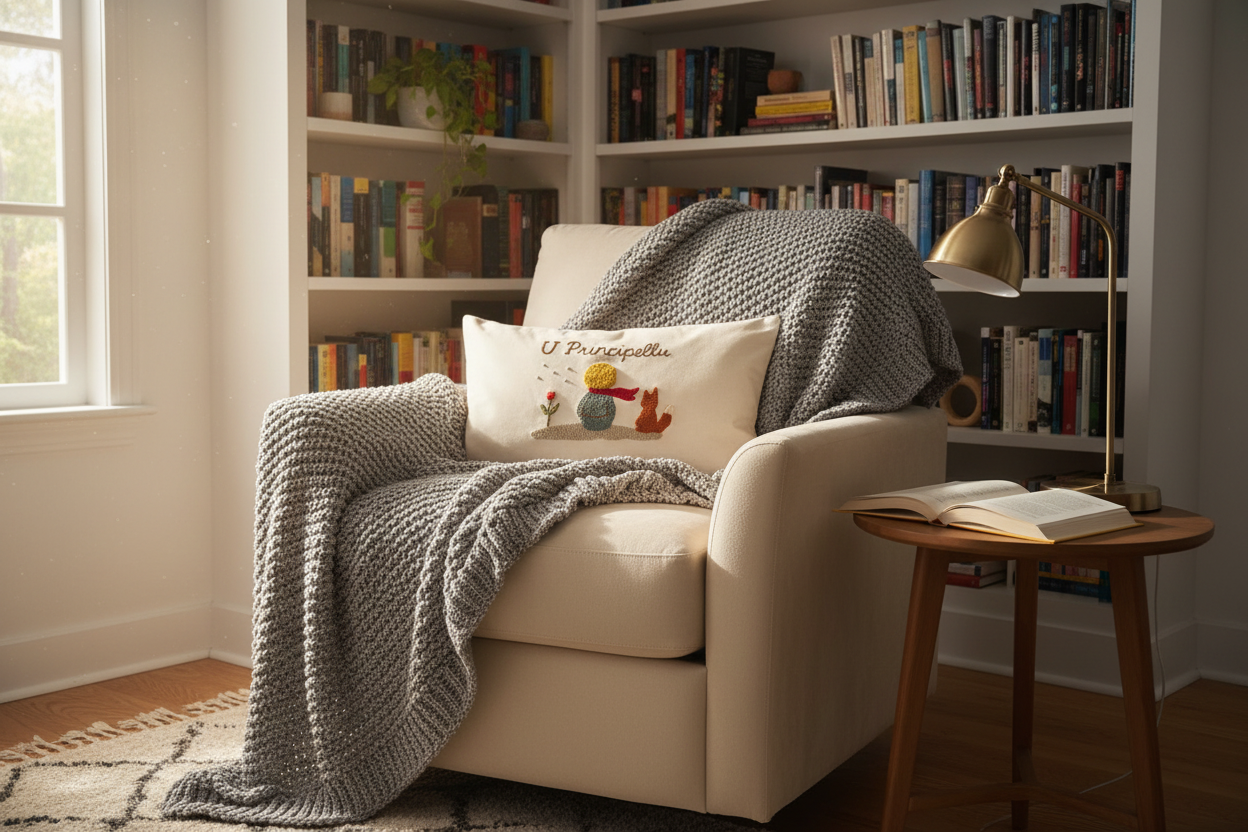 Brodé entièrement à la main en punch needle, ce coussin met en scène un petit prince de dos, son renard fidèle et sa fleur, dans un univers calme et poétique, inspiré du célèbre conte revisité en langue corse.