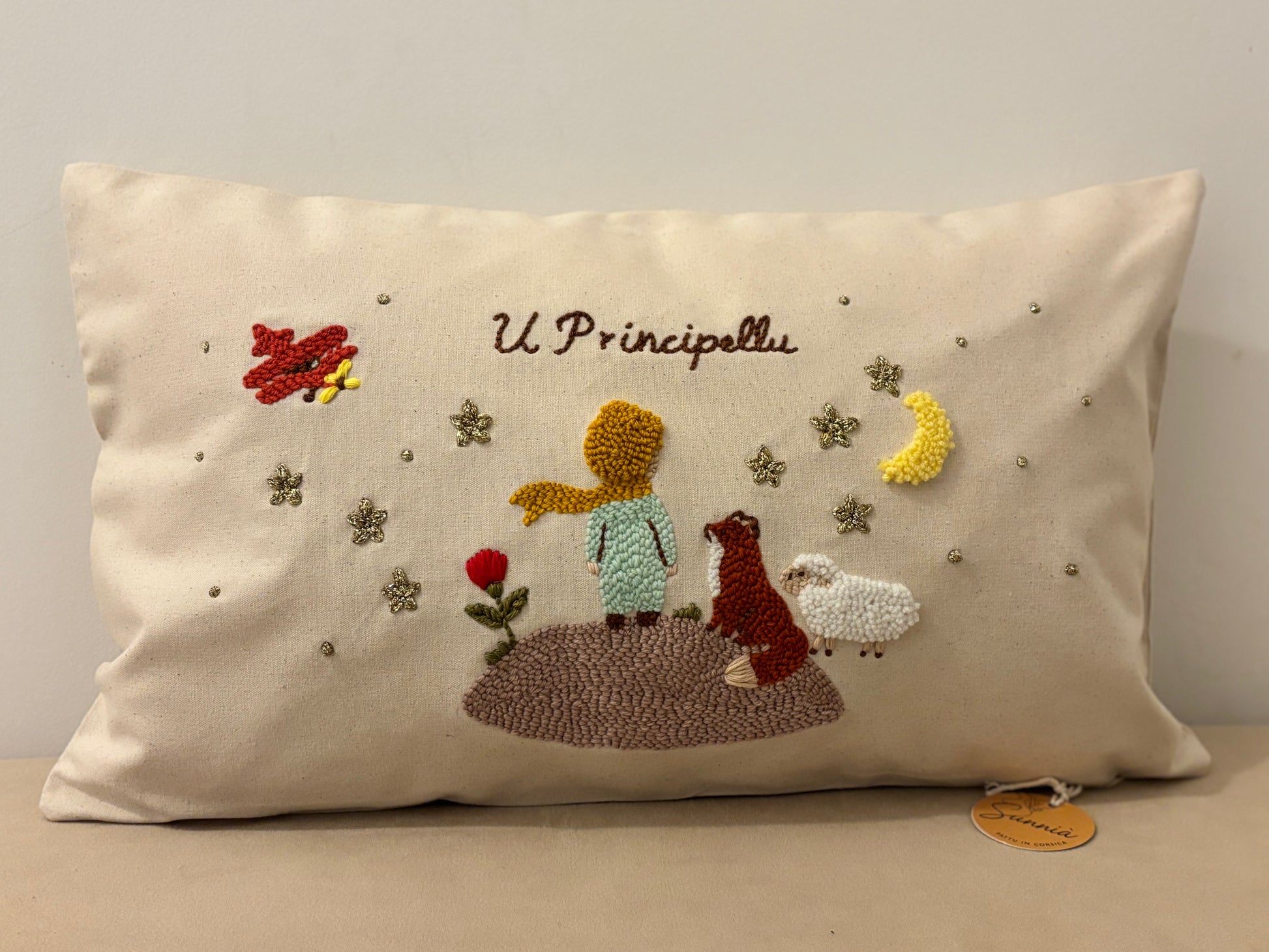 Ce modèle met en scène U Principellu, vu de dos, entouré de sa rose, du renard et de son mouton, sous un ciel parsemé d’étoiles et d’une lune douce.