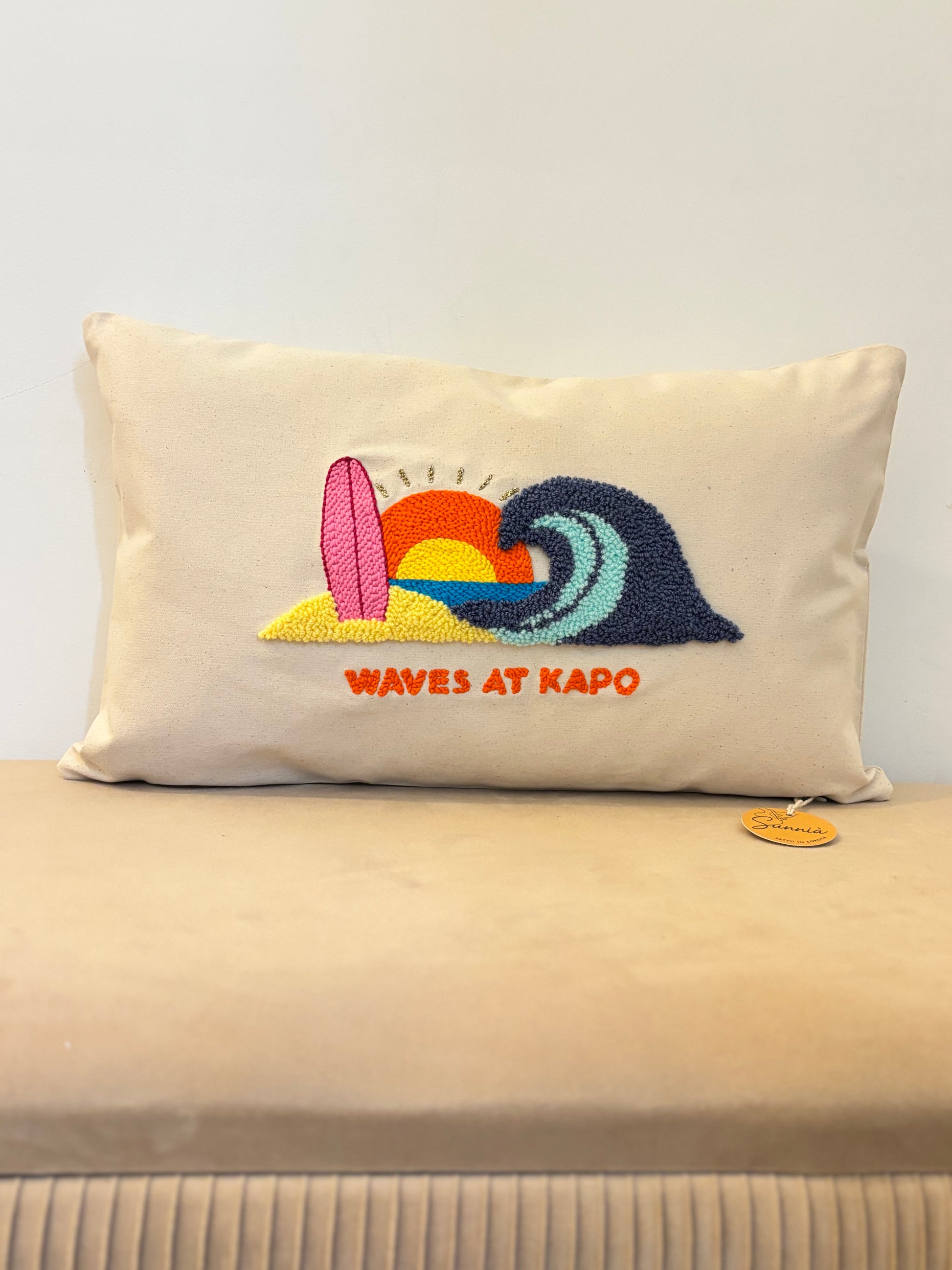 Inspiré par les vagues de Capo di Feno et l’envie d’évasion même en plein hiver, Waves at Kapo est un coussin brodé en punch needle qui évoque le surf, le soleil couchant et la liberté des grands espaces.